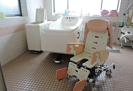 中庭が見える浴室でゆったり快適に入浴していただけます。また、座って入浴できる機械浴も完備しておりおひとりおひとりのお体の状態に合わせて無理なく安心して入浴していただけるようサポートいたします。入浴で心も体もリフレッシュしていただきます。