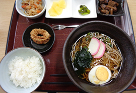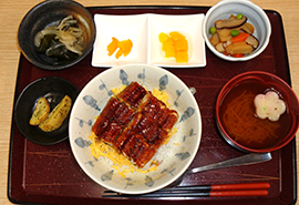 施設内で栄養バランスを考え、専門の調理師が手作りであたたかい食事をご用意しております。季節や行事にあわせたお食事などもご用意しております。バリエーション豊富な手作りスイーツもご用意しております。また、ご利用者様の状態に応じた食事形態もご用意させていただきます。