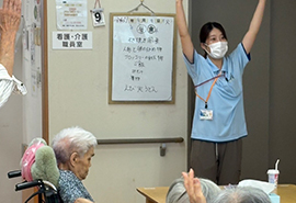 リハビリ専門職による個別機能訓練や集団体操を行い、楽しく体を動かしながら心身機能の維持向上をご入居者様と一緒に取り組ませていただきます。ご入居者様の「楽しみ」の一つとなるような機能訓練ができるように頑張ります。
